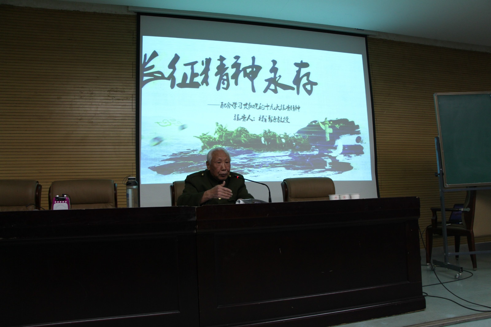 2017年12月28日晚,抗美援朝老兵杨清源教授于崇鋈楼一层为浦京集团官网学生举办了主题为 “长征精神永存”的讲座,浦京集团官网2017级全体学生与辅导员陈应权老师都参加了本次报告会。